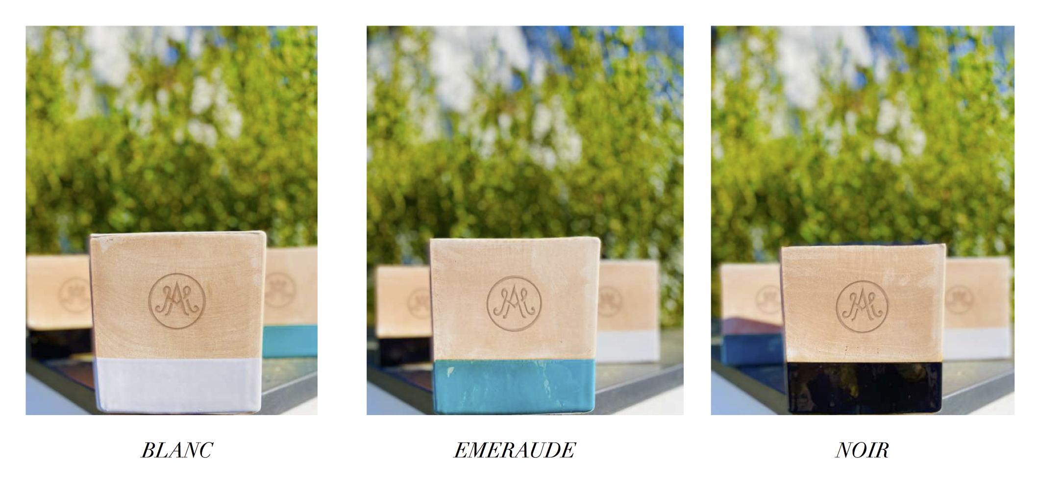 A mix of traditional terracotta and modern coloured enamel. Three colours: white, emerald, black.